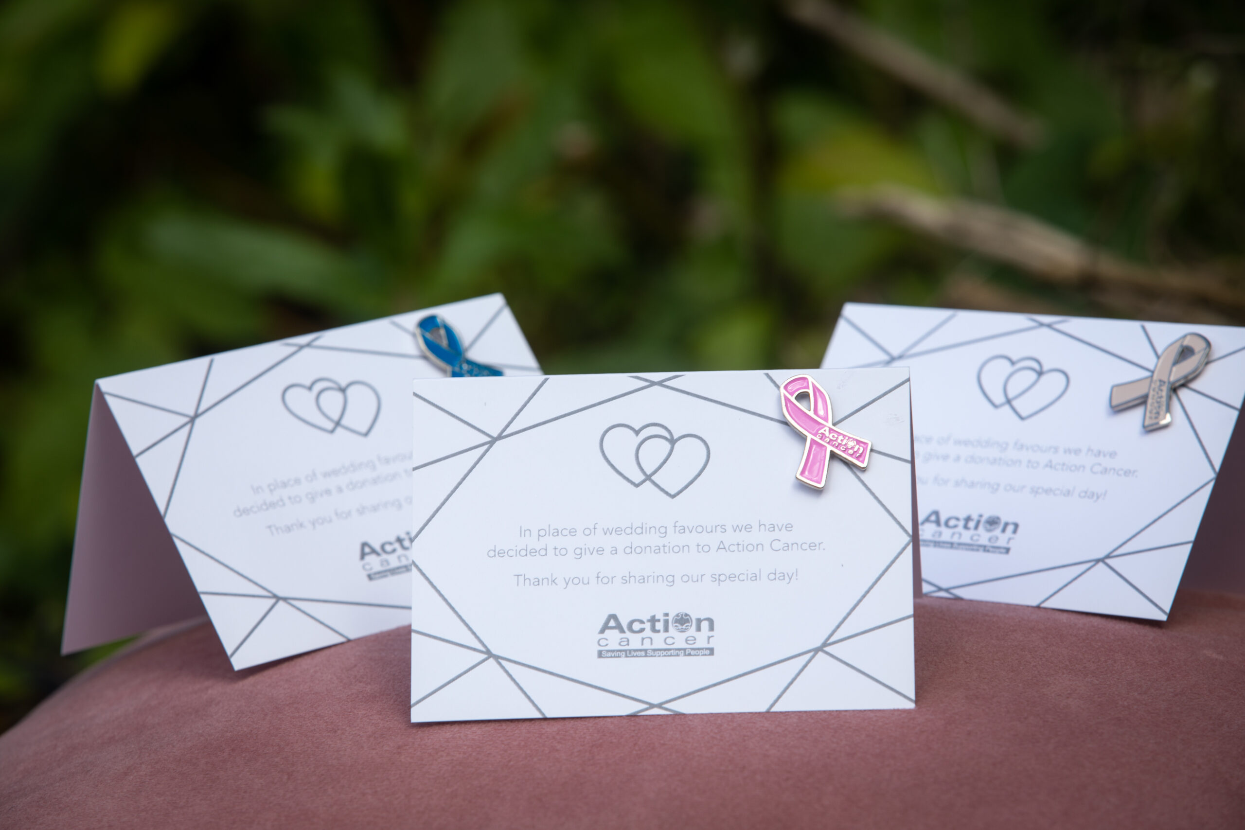 Favour cards have a simple message of thanks and include an Action Cancer pin badge. Pins are available in Ivory, Pink or Blue.